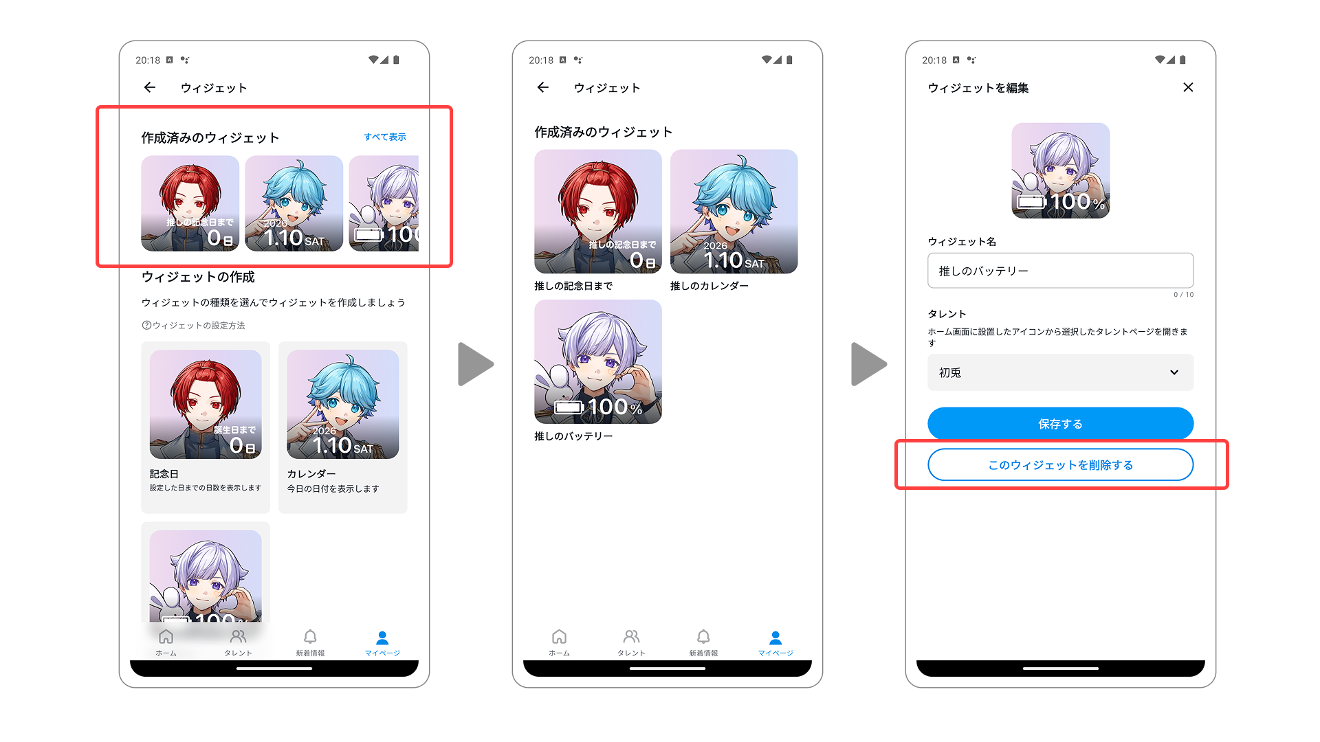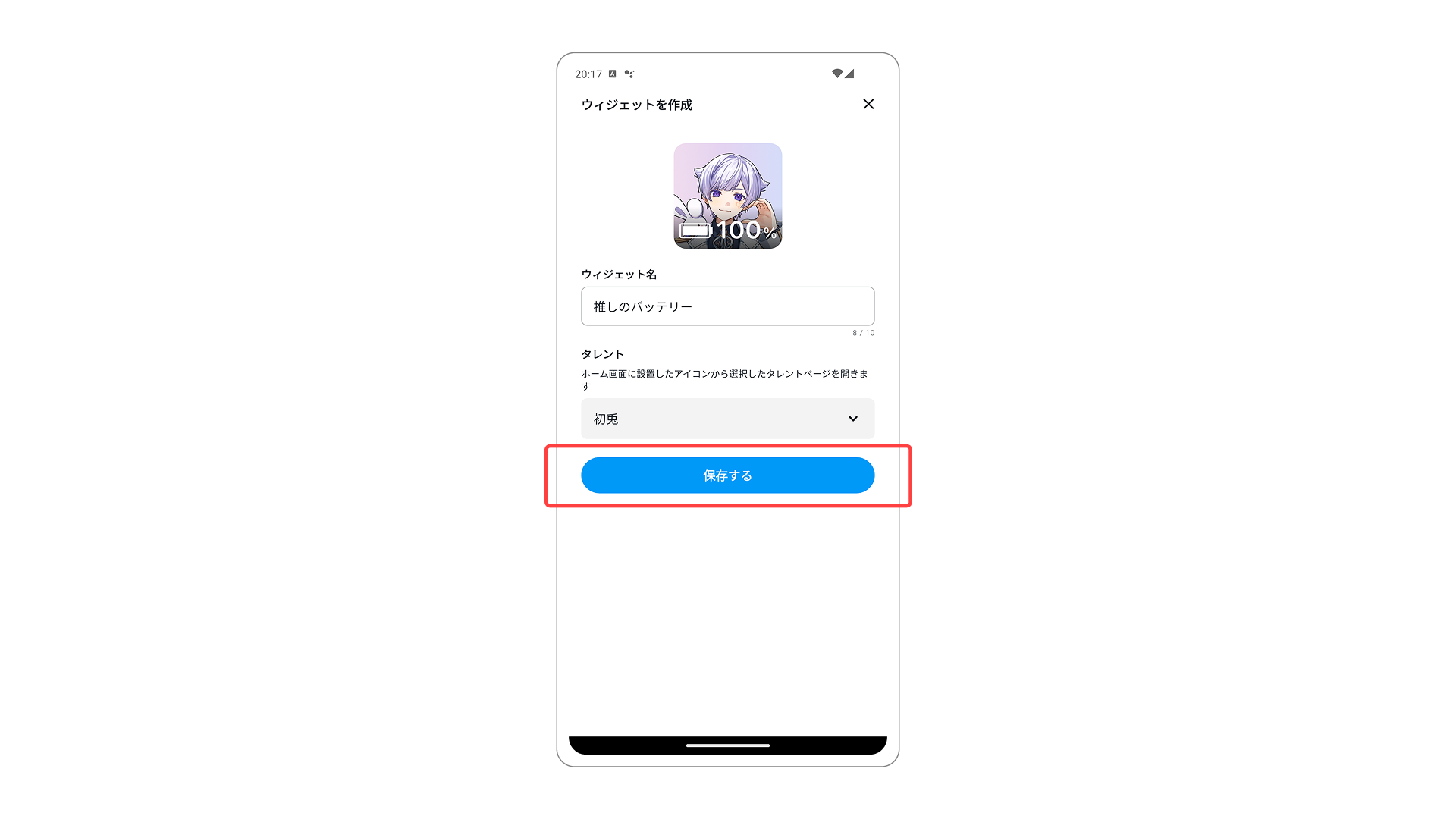 このウィジェットアイコンから遷移したいタレントページのタレントを選択し、背景画像を選択して完成です。