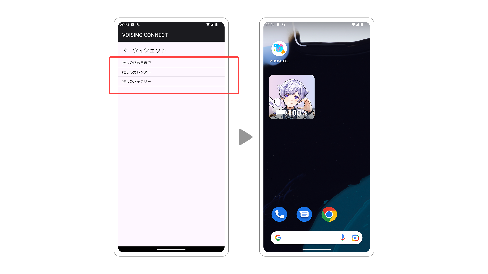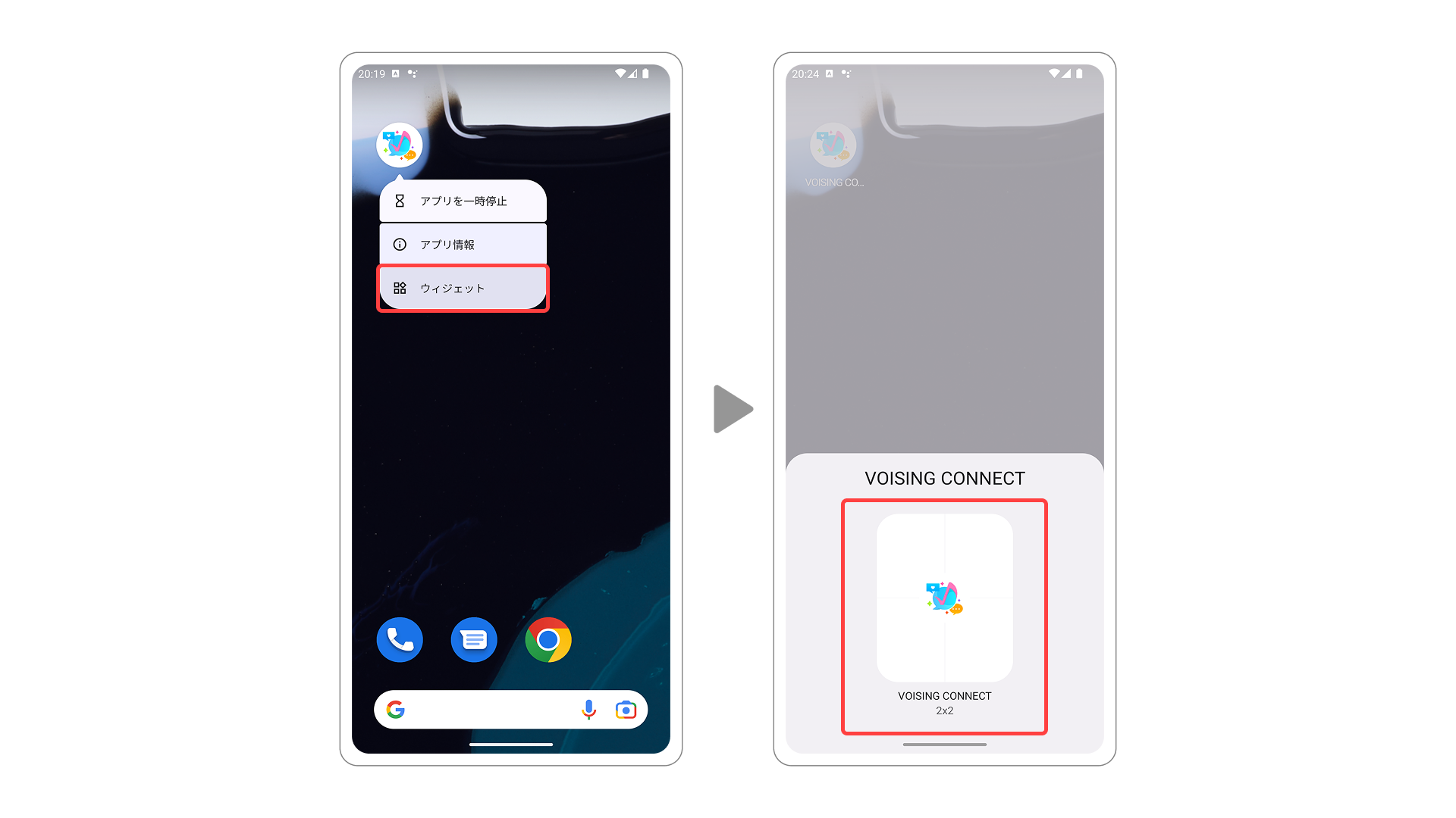 1.端末のホーム画面を開き、VOISING CONNECTアプリのアイコンを長押しし、「ウィジェット」を選択