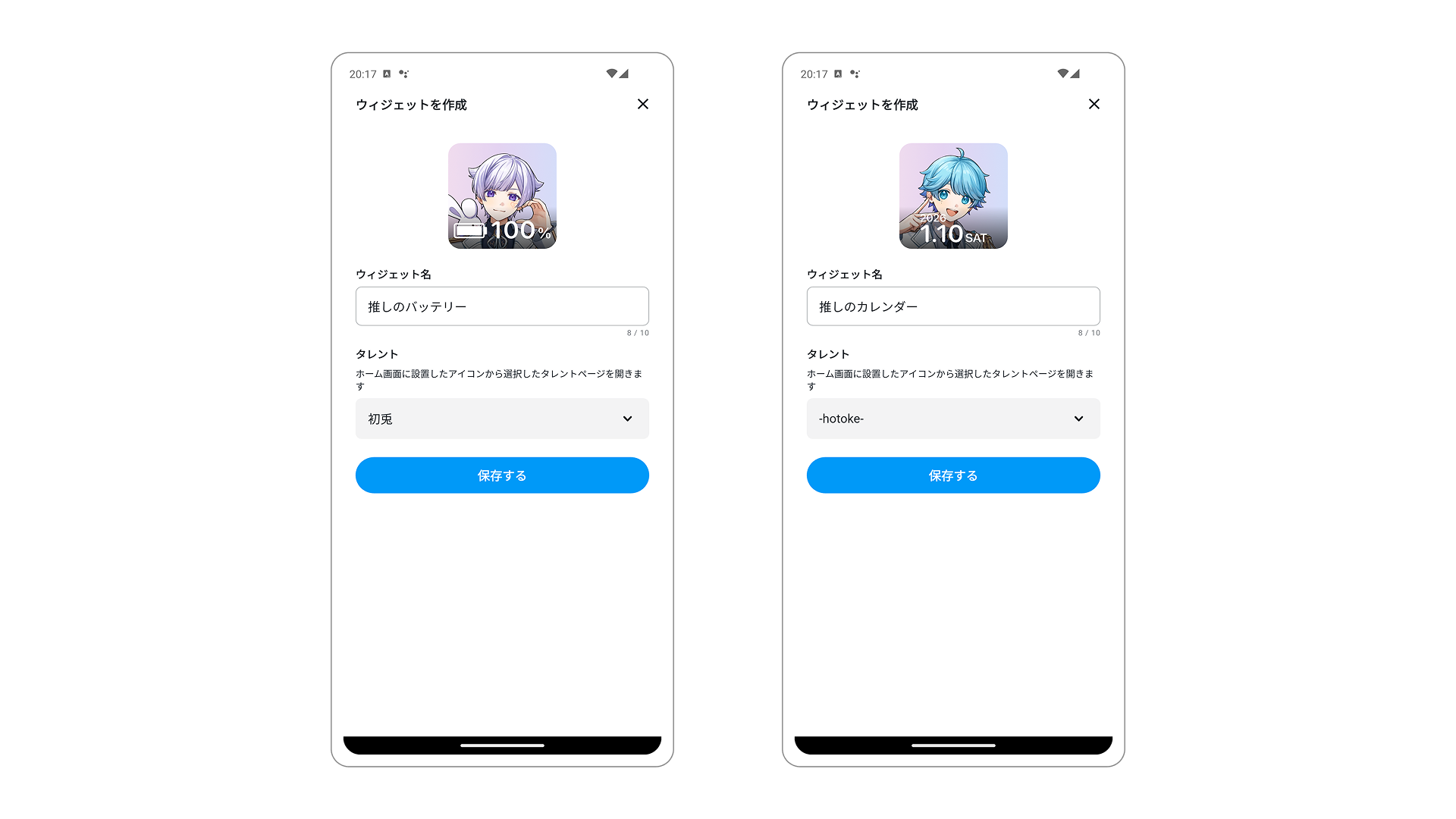 バッテリー、日付ウィジェットと同様に遷移先タレントと画像を設定し、記念日の名前の入力、カウント方法の選択、日付を入力して完成です。ウィジェット上に自動で日数を計算したものが表示されます。